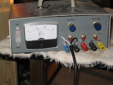 I took apart the headlight buckets and found some rust in between the parts. So, they went back into the bath. I also decided to tackle the bolts holding the pieces of the plastic grille together. I don't have anything large enough in which I could dip an entire grille. So, I set up a re-circulating flow using a 1 GPH bilge pump and a length of hose. I picked up the pump for $10 at Princess Auto. I had the hose already. I simply rested the grille, face down over the tub and supported the other end with a 5 gallon pail. Perfect set up. I ran the pump using the bench power supply that I built in college so many years ago. It still works great.